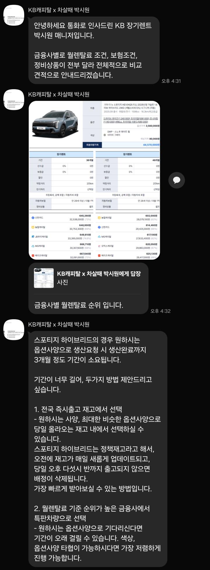 우연히 차살때 광고를 보고 김효린 매니저님을 만나서 너무 다행이었어요ㅠㅠ 우선 전반적인 응대가 너무 친절했고, 문의할 때마다 빠르게 답변을 주셔서 진행 과정이 전혀 답답하지 않았어요. 제가 원하는 조건을 말씀드리니까 여러 모델을 비교해주시고, 그중에서 가성비 좋은 차량을 가장 저렴한 가격으로 찾아주셨어요. 덕분에 고민 오래 안 하고 바로 결정할 수 있었습니다!! 또 제가 타던 기존 차량도 판매해야 했는데, 그 부분까지 친절하게 도와주셔서 너무 감사했어요ㅜ.ㅜ 그리고 무엇보다 여성 딜러분이라 상담할 때 훨씬 편안하고 부담이 없었어요. 세심하게 챙겨주시는 느낌도 있어 더 믿음이 갔구요🥹 전체적으로 정말 만족스러운 경험이라 차량 렌트 생각 있으신 분들께 효린매니저님을 강력 추천드리며 매니저님께 감사인사를 드려요🫶🏻